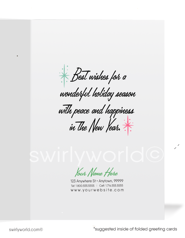Our cards pop with authentic mid-century typography that brings the retro vibe to life, adding a one-of-a-kind charm to your holiday greetings. Make it personal with a custom message on these unique cards and envelopes for a warm, memorable touch. Printed on premium matte stock, these cards are all about quality and aesthetic, ready to impress.