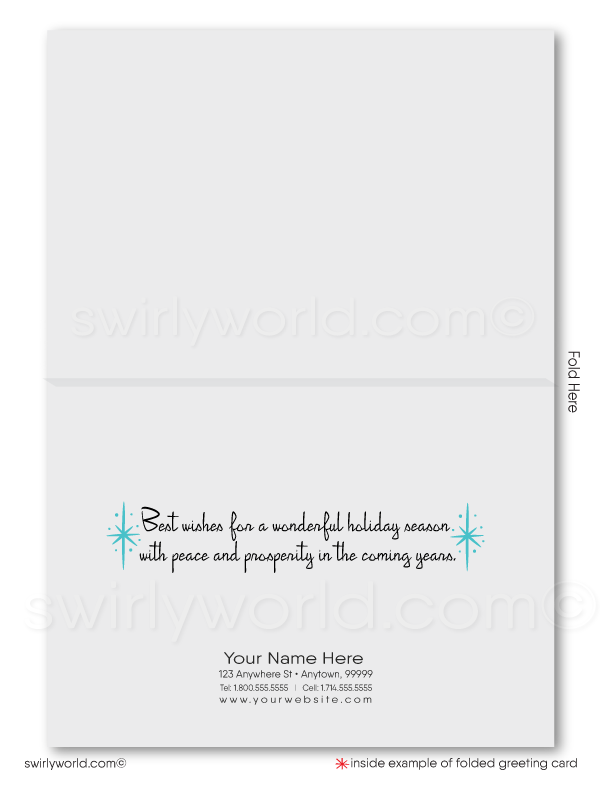 Choose from two card options: the budget-friendly single-panel "flatcard" or a classic folded style for a more traditional touch. You can personalize the wording and add your logo for a branded touch. Both come with matching white envelopes, and you can further customize them by upgrading to personalized imprinted envelopes featuring your name, return address, and coordinating design elements. Make a lasting impression and strengthen your business relationships with these distinctive  and exclusive retro holiday cards.