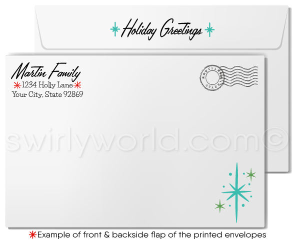 What makes our cards stand out is the authentic mid-century typography, immersing you in the retro era and adding a unique charm to your holiday greetings. Enhanced with retro starbursts, iconic symbols of the atomic mid-century period, our cards boast a touch of vintage elegance.