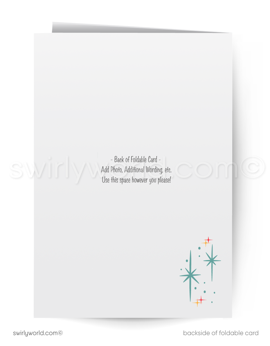 Swirly World Designs backs this product with high-quality printing standards and customer satisfaction guaranteed. Our customers praise the vivid artwork and premium feel of these nostalgic holiday designs, making them perfect for sending warm wishes during the festive season. Whether you’re looking for mid century holiday cards or personalized Christmas greetings, this vintage Christmas card is an ideal choice for spreading joy and classic charm.