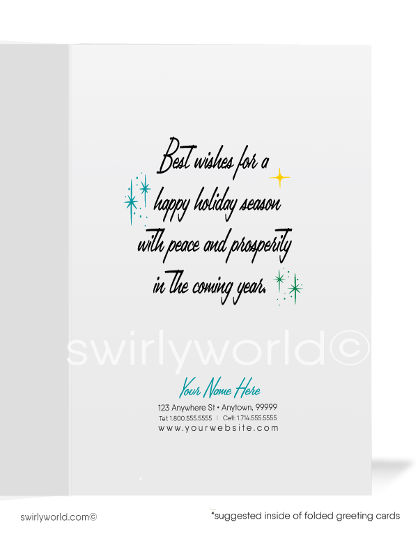 Take a step back in time with our exclusive vintage holiday greeting card, bringing all the warmth and nostalgia of a bygone era. This unique card celebrates classic holiday charm, featuring an iconic 1960s mid-century mod atomic candle radiating with retro starbursts and the cheerful message "Happy Holidays."