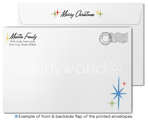 Choose between a sleek single-panel flat card or a classic folded option for a timeless look. Both come with matching white envelopes, with an option to upgrade to custom imprinted envelopes featuring your name, return address, and coordinating design elements. Let these distinctive, retro holiday cards make a lasting impact and elevate your holiday greetings.