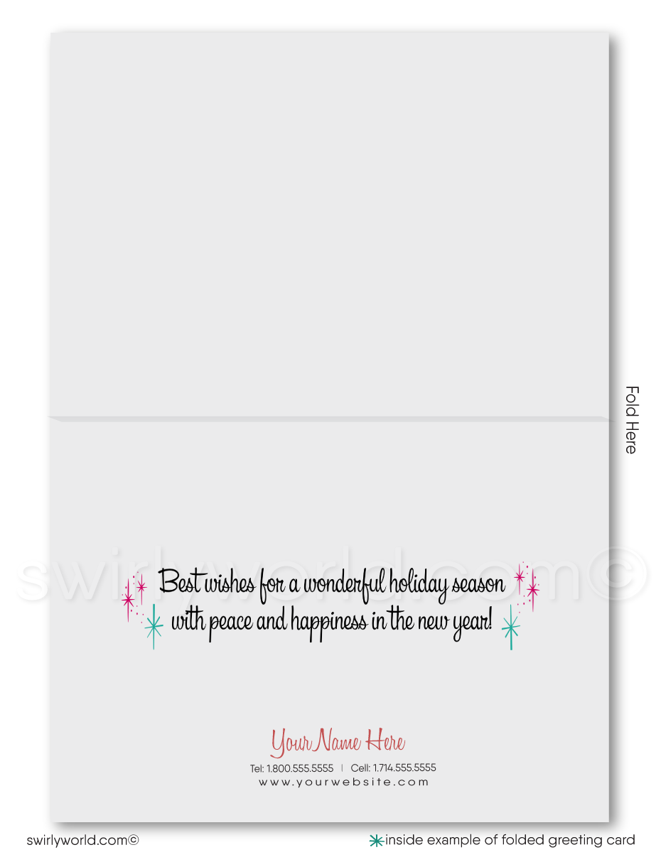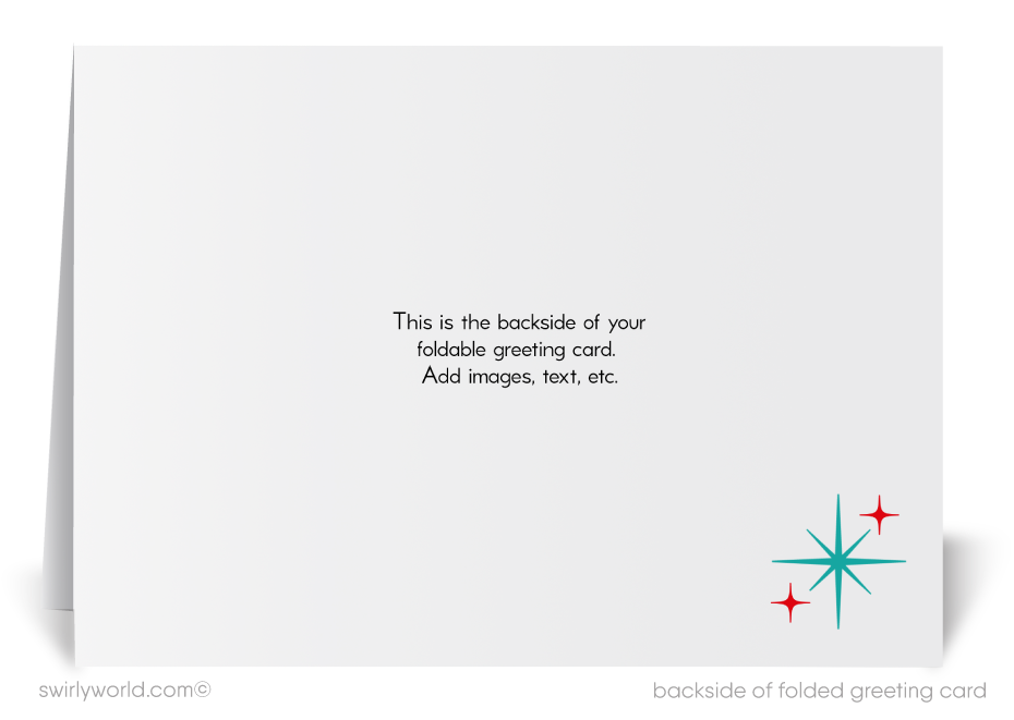 What sets our cards apart is the authentic mid-century typography, transporting you to the retro era and infusing a unique charm into your holiday greetings. Adorned with retro starbursts, iconic symbols of the atomic mid-century period, our cards add a touch of vintage elegance.