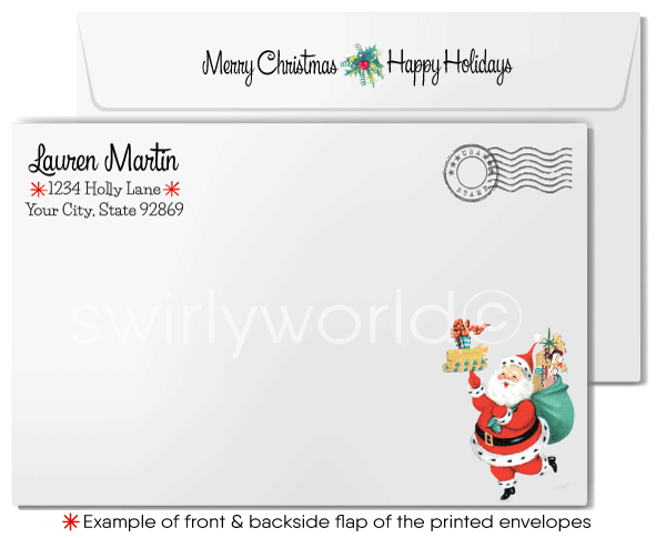 Crafted on premium, durable card stock, our cards are a testament to quality. Choose from two card options: the budget-friendly single-panel "flatcard" or a classic folded style for a more traditional touch. You can personalize the wording and add your logo for a branded touch. Both come with matching white envelopes, and you can further customize them by upgrading to personalized imprinted envelopes featuring your name, return address, and coordinating design elements. Make a lasting impression and strengthen your business relationships with these distinctive holiday cards.