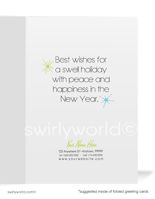 Our cards pop with authentic mid-century typography that brings the retro vibe to life, adding a one-of-a-kind charm to your holiday greetings. Make it personal with a custom message on these unique cards and envelopes for a warm, memorable touch. Printed on premium matte stock, these cards are all about quality and aesthetic, ready to impress.