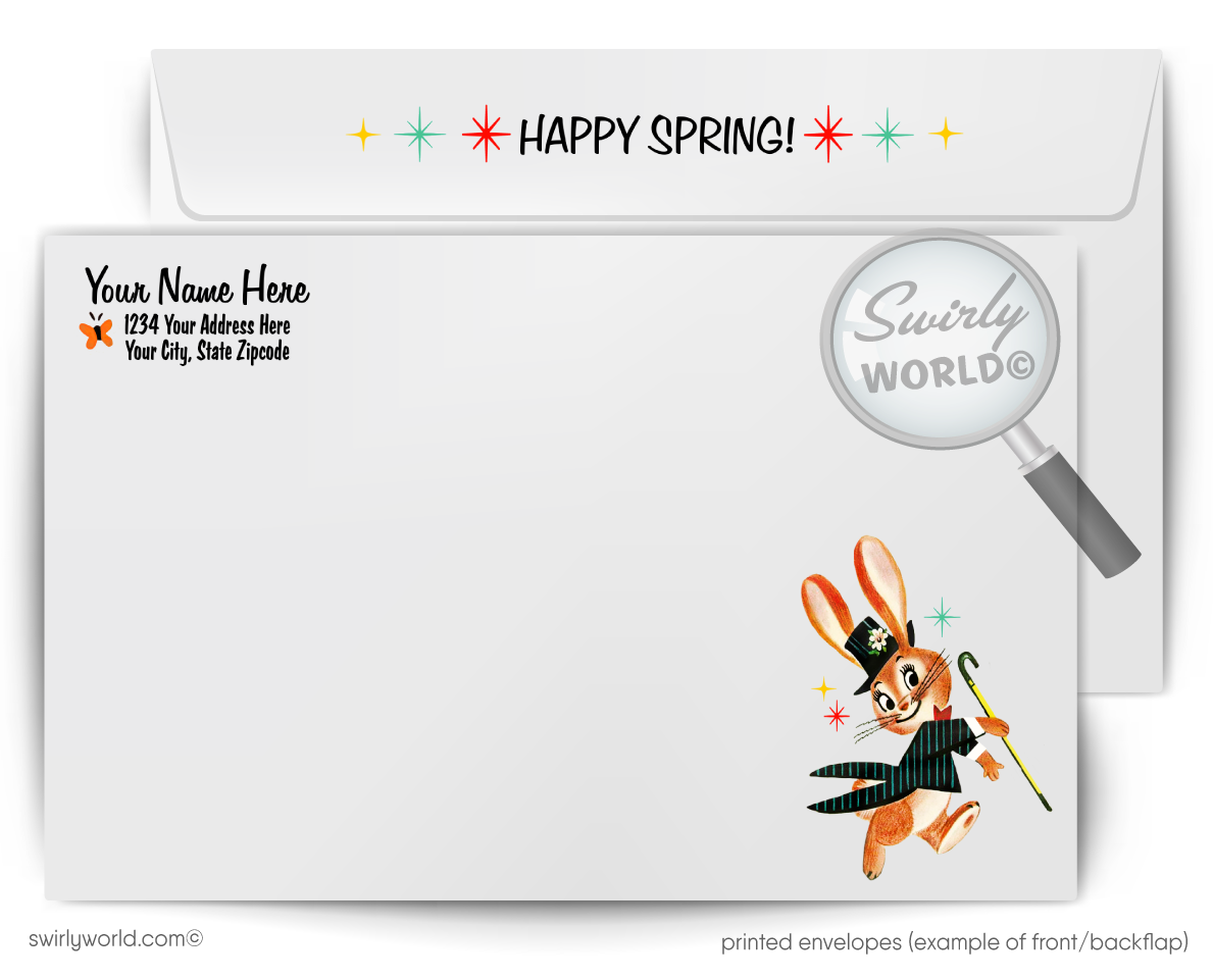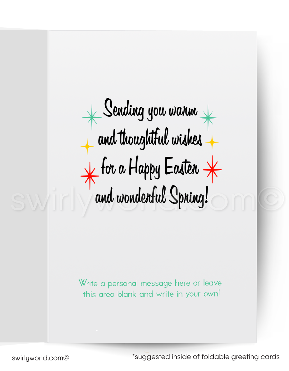 Celebrate Easter in true vintage fashion with our exclusive 1950s-style Happy Easter card, designed to capture the charm and nostalgia of a bygone era. This delightful, one-of-a-kind design features a kitschy daddy rooster with a magnificent, colorful feathered tail, dressed in a dapper Easter suit and strolling proudly with his baby chick, who’s sporting an adorable blue bowtie. The daddy rooster carries a cane as they parade together in perfect springtime style. Set against a cheerful retro blue backdrop and accented with classic mid-century modern typography, this card is a charming way to celebrate the season with timeless retro flair.