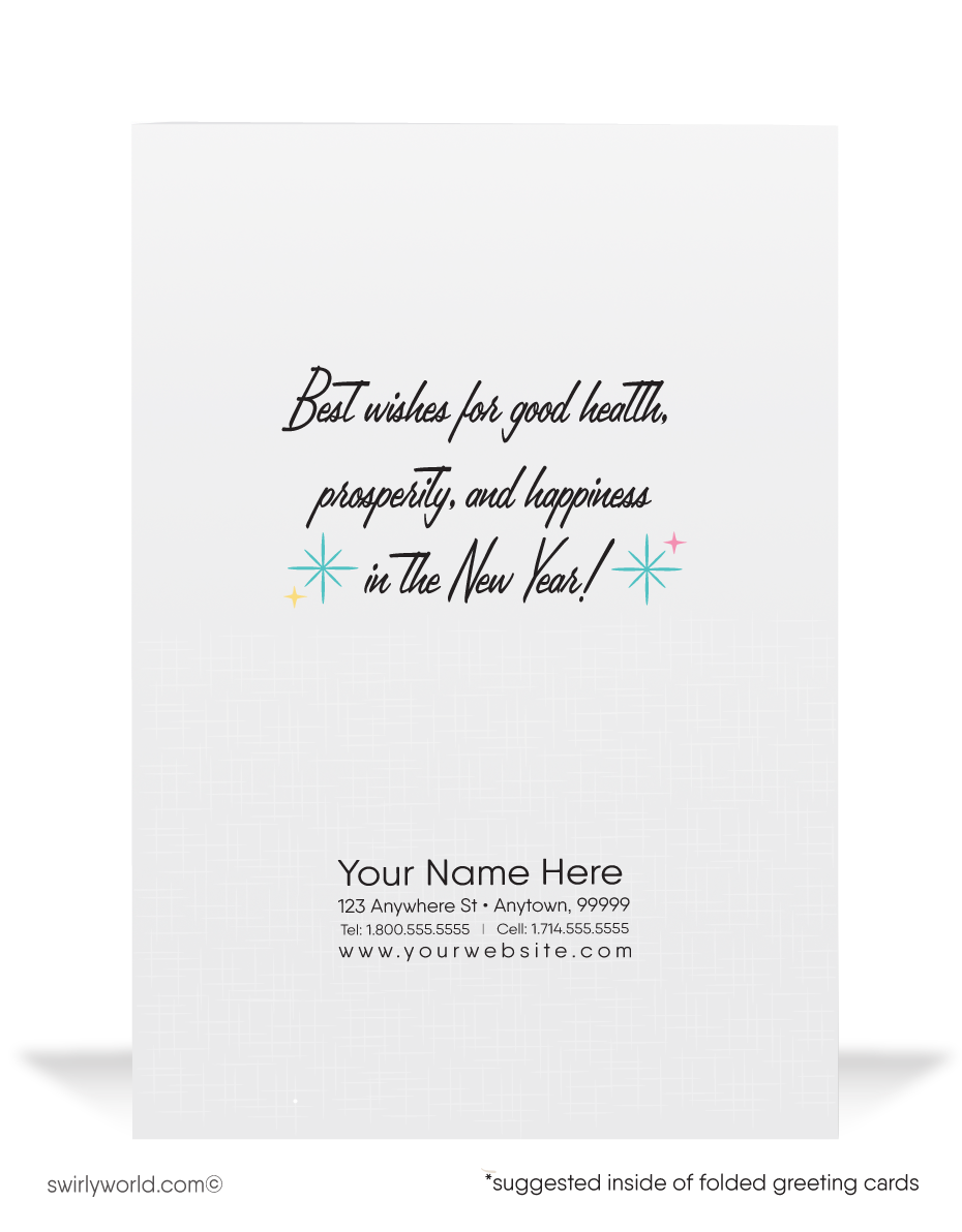 Welcome the New Year with a touch of mid-century modern elegance with our 'Cheers' Retro 1950s New Year Greeting Card! This stunning card embraces the iconic design elements of the era, featuring a stylish array of martini and champagne glasses, adorned with whimsical starbursts and cascading streamers. The word 'Cheers' graces the front of the card, capturing the spirit of celebration and togetherness that defines the holiday season.