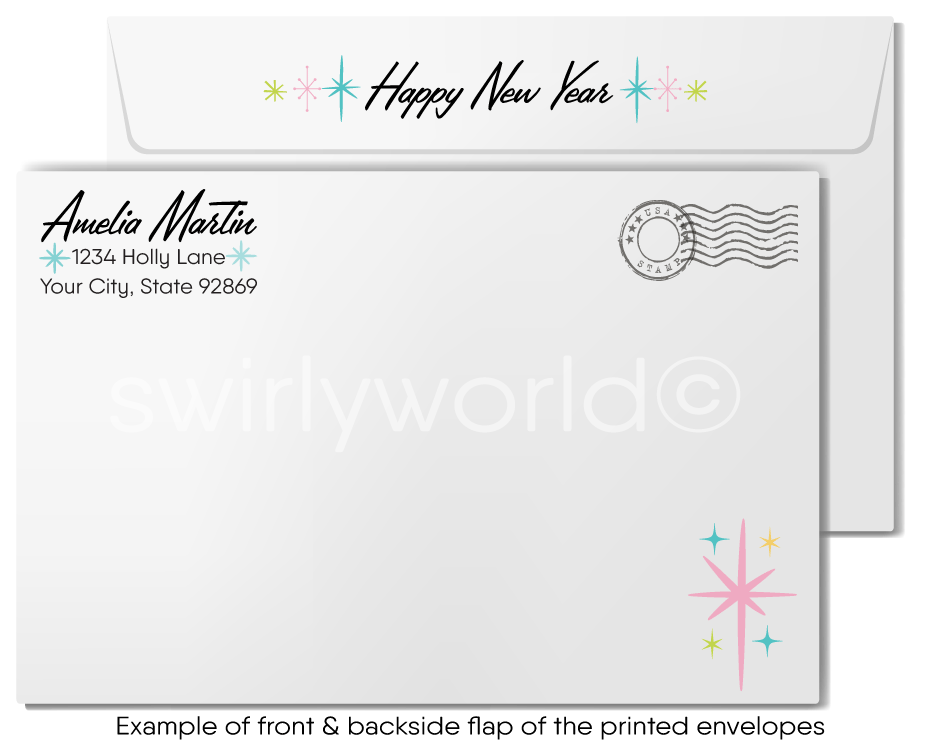 Choose between a sleek single-panel flat card or a classic folded option for a timeless look. Both come with matching white envelopes, with an option to upgrade to custom imprinted envelopes featuring your name, return address, and coordinating design elements. Let these distinctive, retro holiday cards make a lasting impact and elevate your holiday greetings.