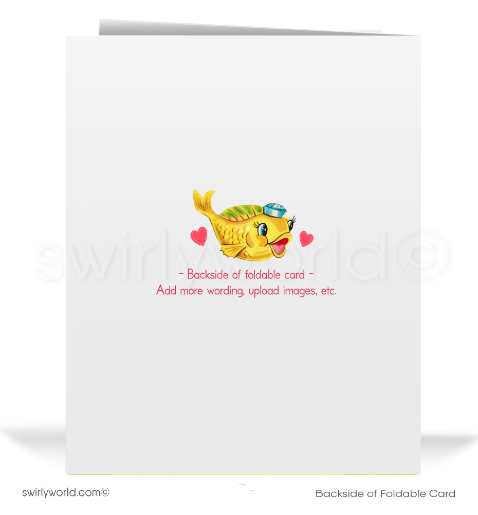 Transport yourself to a bygone era this Valentine’s Day with our delightful collection of vintage kitschy cards, inspired by the charming aesthetic of the 1940s and 1950s. Each card in this collection is a nostalgic tribute to mid-20th century design, featuring enchanting retro artwork that captures the whimsy and romance of the time. This particular Valentine’s card showcases a captivating mermaid in an under-the-sea setting, surrounded by playful ocean creatures, including a starfish, a cheerful crab, and an adorable yellow fish clutching a heart. The heartfelt message, "Oceans of Love," perfectly completes this whimsical design.