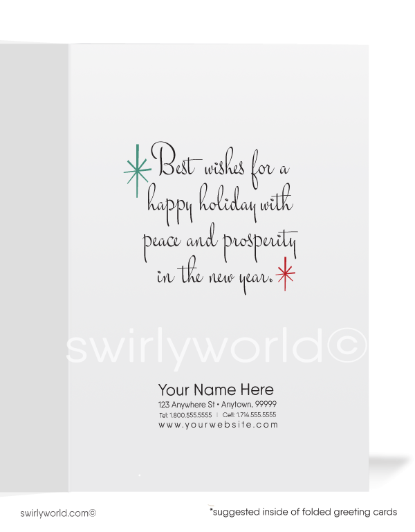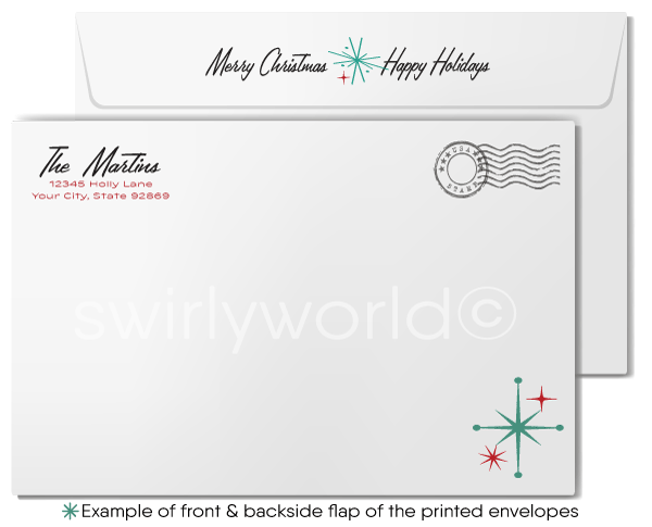 These mid century holiday cards evoke the spirit of the 1950s Christmas cards era while offering modern convenience and quality. The starburst Christmas card design adds a festive sparkle that complements any holiday greeting card collection. Whether you're sending holiday greeting cards to family, friends, or clients, these retro holiday cards make a memorable impression.