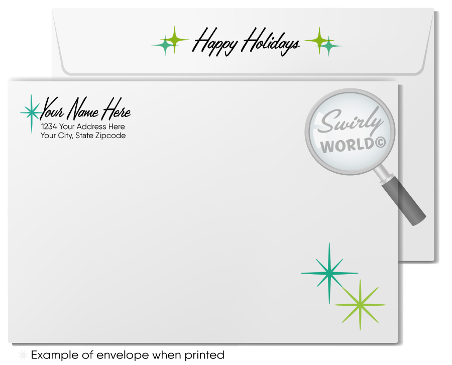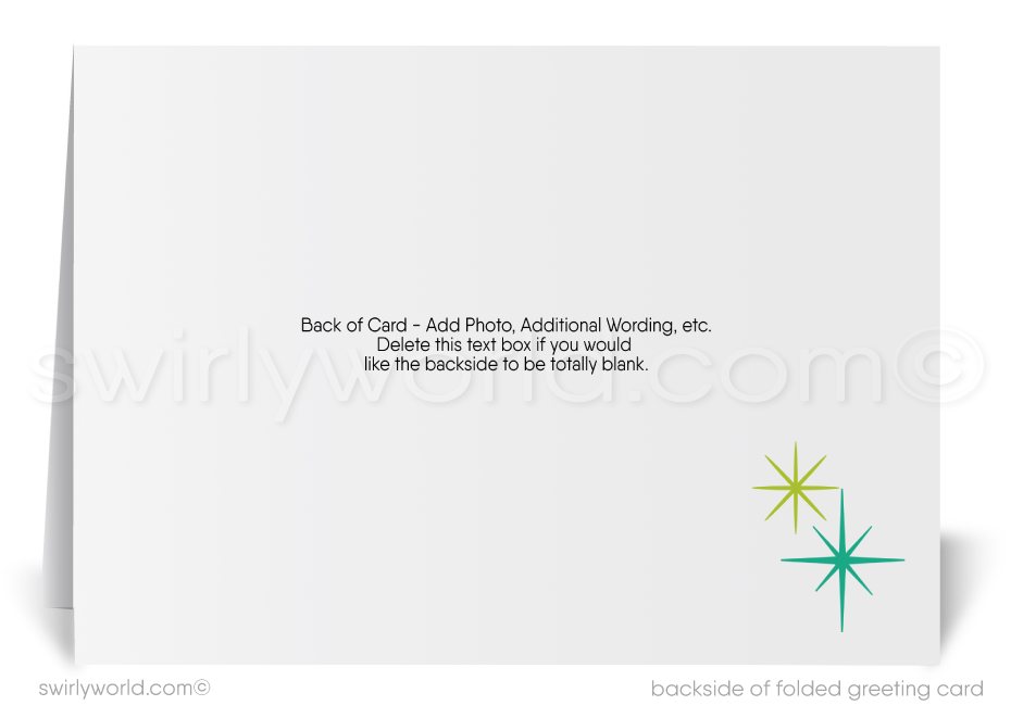 Mid century holiday cards bring a stylish and memorable way to send your season's greetings with a retro modern greeting card featuring a starburst design. These mid century holiday cards showcase a refreshing blue and green palette inspired by 1960s mod design cards, perfect for anyone looking to impress clients, customers, or loved ones with unique vintage Christmas cards. Crafted by Swirly World Designs, these printed vintage style cards combine atomic modern Christmas aesthetics with precise craftsmanship to deliver both beauty and durability.