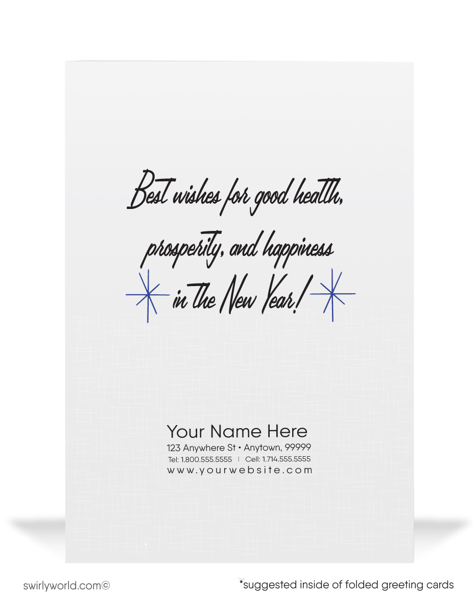 Choose between a sleek single-panel flat card or a classic folded option for a timeless look. Both come with matching white envelopes, with an option to upgrade to custom imprinted envelopes featuring your name, return address, and coordinating design elements. Let these distinctive, retro holiday cards make a lasting impact and elevate your holiday greetings.