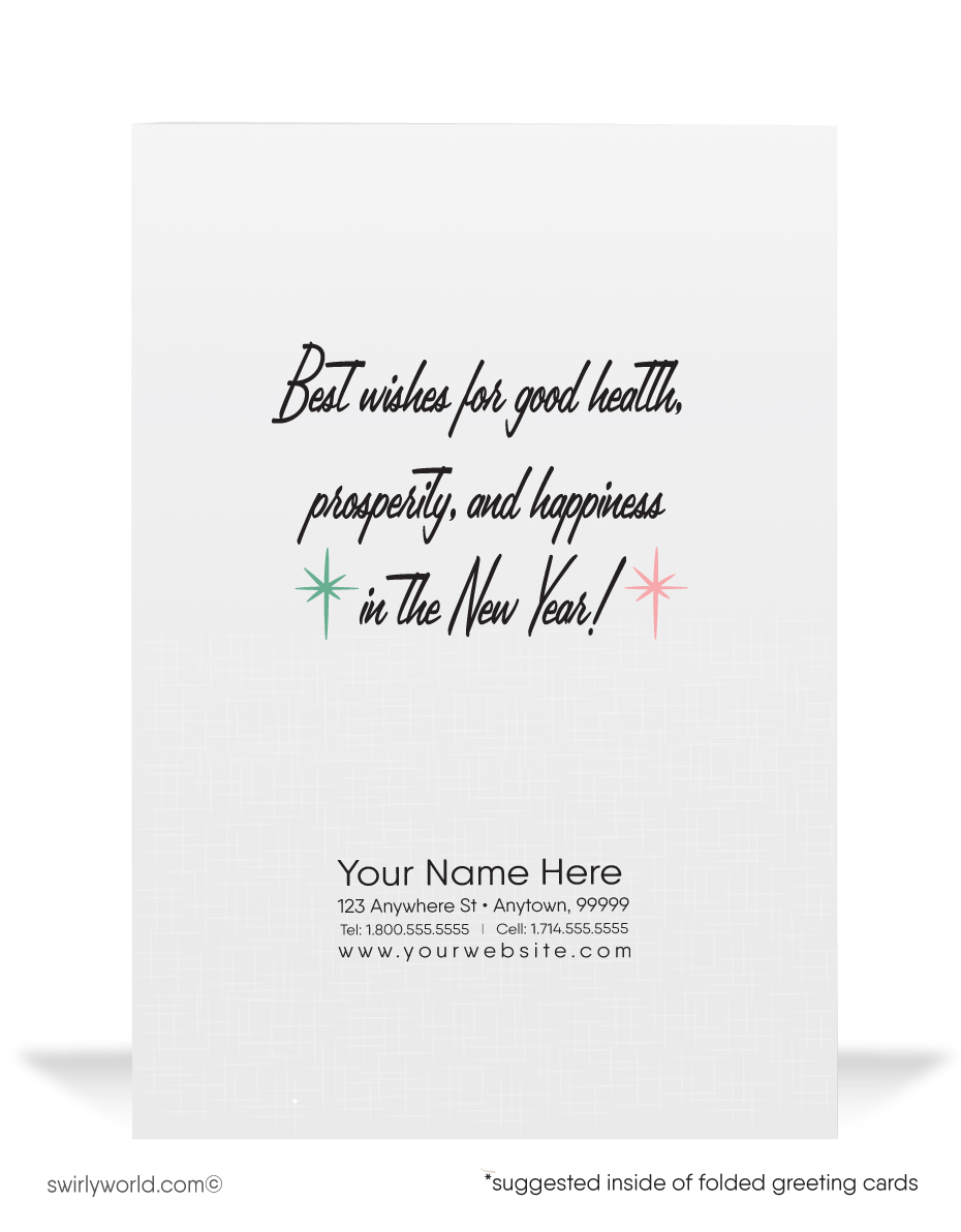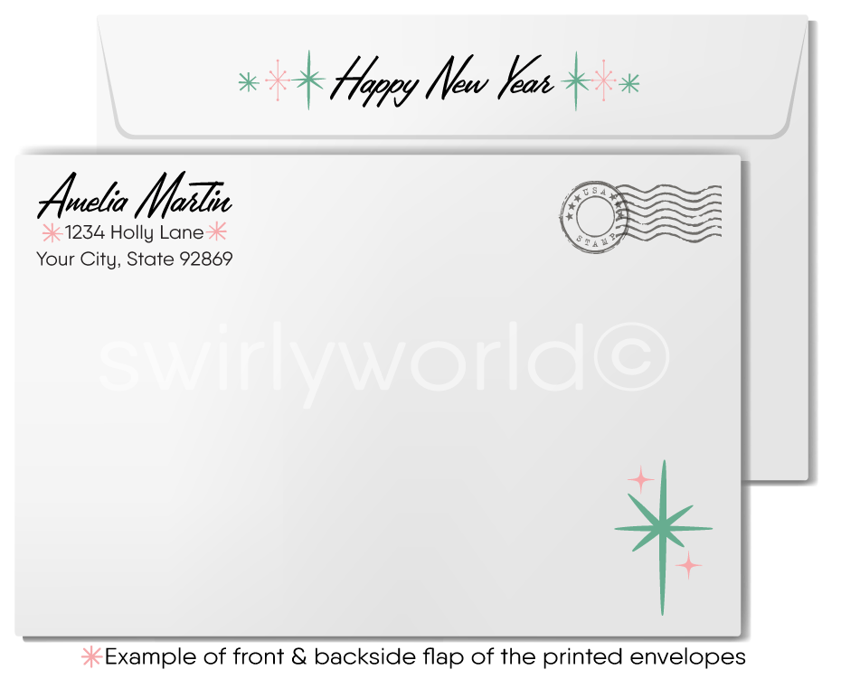 Our cards pop with authentic mid-century typography that brings the retro vibe to life, adding a one-of-a-kind charm to your holiday greetings. Make it personal with a custom message on these unique cards and envelopes for a warm, memorable touch. Printed on premium matte stock, these cards are all about quality and aesthetic, ready to impress.
