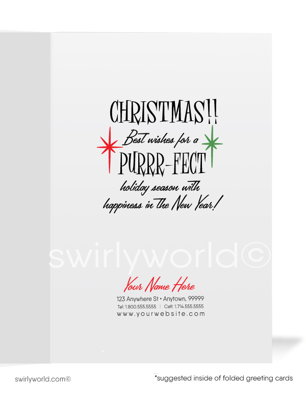 Take a nostalgic journey with our exclusive vintage Christmas holiday card, designed to capture the warmth and charm of a bygone era. This one-of-a-kind card celebrates classic Christmas traditions, offering a delightful glimpse into the magic of the season as it once was. Featuring an adorable "Meowy Christmas" kitty in Santa's hat, this charming design embodies mid-century modern atomic style with playful holiday flair.