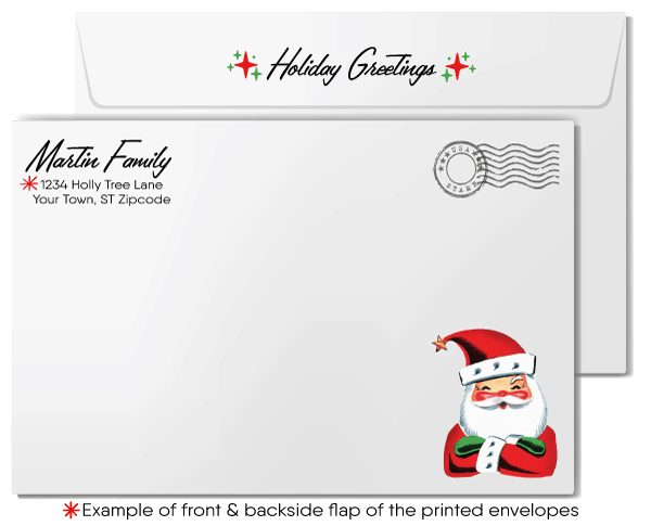 Choose between a sleek single-panel flat card or a classic folded option for a timeless look. Both come with matching white envelopes, with an option to upgrade to custom imprinted envelopes featuring your name, return address, and coordinating design elements. Let these distinctive, retro holiday cards make a lasting impact and elevate your holiday greetings.