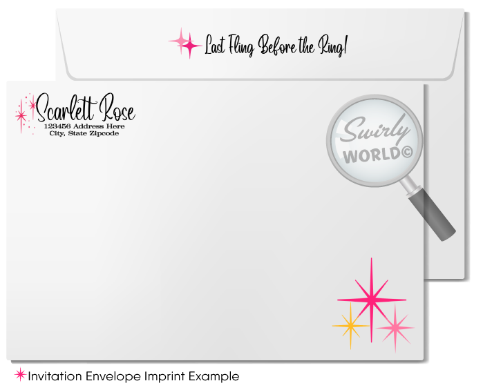 Dive into the vibrant world of the 1960s with our Retro 60s Vintage Style Bachelorette Party Design Set, perfectly capturing the spirit of an era defined by bold colors and groundbreaking design. This exclusive collection features a beguiling mod bride, whimsically swinging inside a large, vintage mid-century style engagement ring, set against a backdrop of retro pink and sunny yellow hues. Atomic style starbursts and classic 1960s typography complete the scene, embodying the optimistic and adventurous spirit of the time.