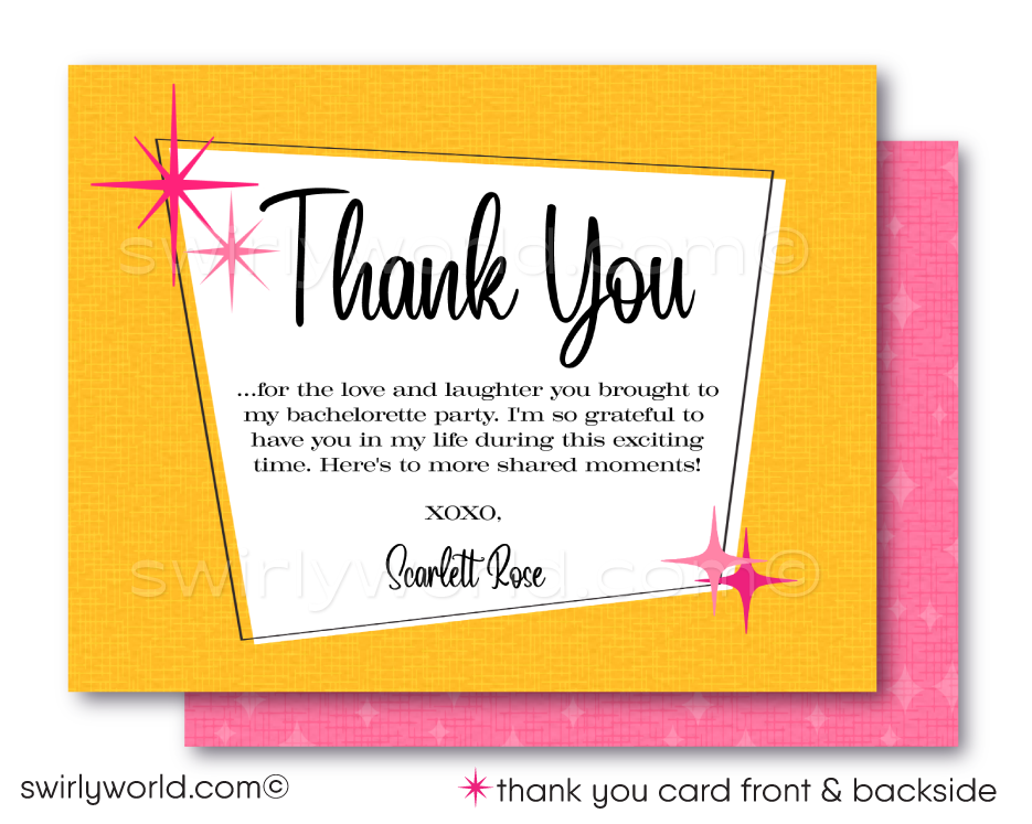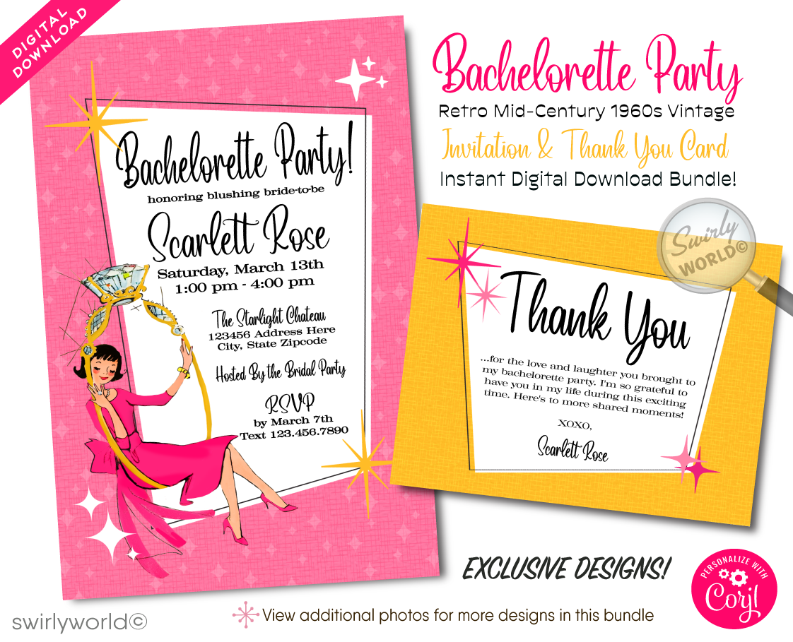 For those with a penchant for the past and an appreciation for mid-century mod design, this Bachelorette design set is more than an invitation—it's a gateway to an era of style, innovation, and fun. Whether you're planning a laid-back gathering or a full-blown celebration, this set promises to kickstart your event with an unmistakable 1960s vibe. Get ready to dazzle your guests with a nod to the past while celebrating the future. Embrace the spirit of the 1950s and 1960s with this exquisite, instantly downloadable set, and let the countdown to the celebration begin!