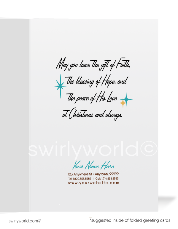 Our 1950s holiday cards are more than just retro Christmas cards—they are keepsakes that evoke warm memories and celebrate religious Christmas traditions with style. The kitschy angel ornament featured on each card adds a whimsical yet reverent tone, perfect for sending heartfelt Christian holiday cards during the festive season.