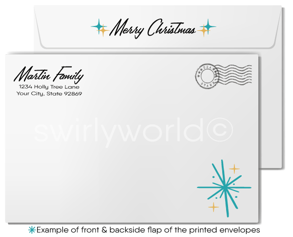 Our vintage Christmas cards bring the charm of the 1950s holiday season right to your doorstep, featuring a kitschy angel ornament and a retro starburst design that perfectly captures mid century Christmas spirit. These vintage greeting cards offer nostalgic Christmas greetings with authentic mid century typography and atomic mod holiday elements, making them ideal for anyone who loves old fashioned Christmas style and Christian holiday cards.