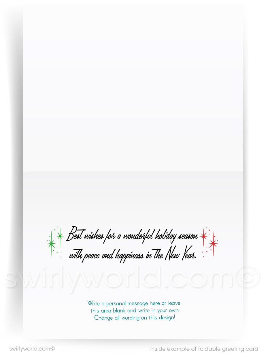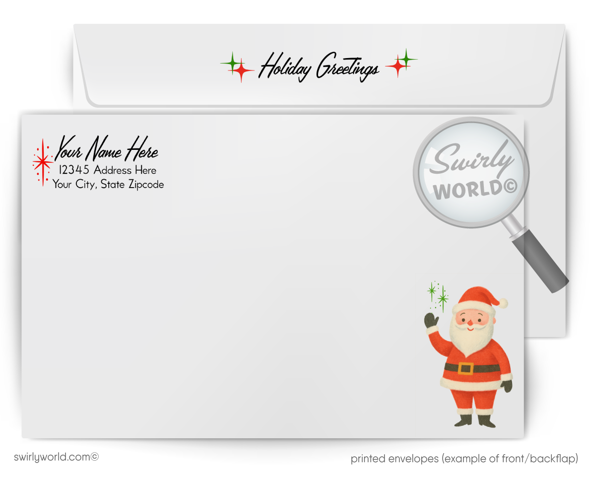 Our vintage Christmas card captures the nostalgic spirit of the holidays with a charming mid-century holiday cards design featuring Santa Claus flying an airplane. This vintage Christmas card delivers a heartfelt, retro holiday greeting that transports you to the joyful 1950s Christmas season. Crafted to evoke warmth and tradition, it offers a unique way to send personalized holiday wishes with a classic touch.