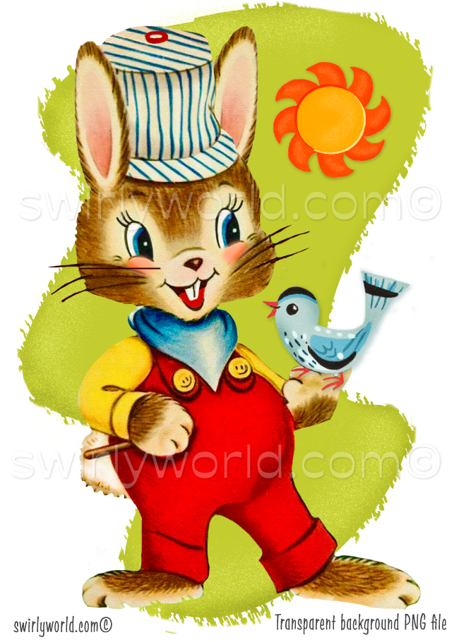 Step back in time with our exclusive collection of rare vintage 1940s–1950s kitschy spot art illustrations, beautifully restored and ready for digital download. This rare mid-century modern design bundle captures the vibrant charm and kitschy elegance of classic retro style, featuring six high-resolution downloadable authentic vintage images with transparent PNG backgrounds featuring retro 1940s-1950s spring animal illustrations showcasing adorable baby critters like bunnies, squirrels, skunks, pandas, foxes, and teddy bears.